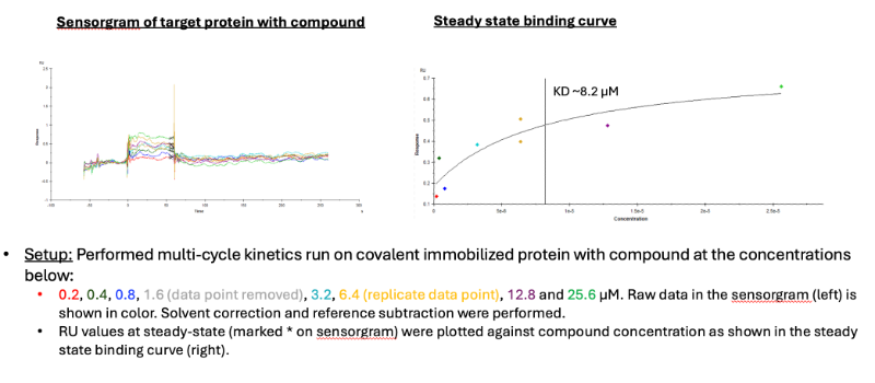 In the sensorgram result, we see very boxy response traces for all compound concentrations and the signal is very low. I am not sure if this indicative of just bulk solvent effects, or if there are true binding events occurring with very fast on and off rates, or even a combination of both. The program used the steady-state to generate the binding curve and determined a KD.